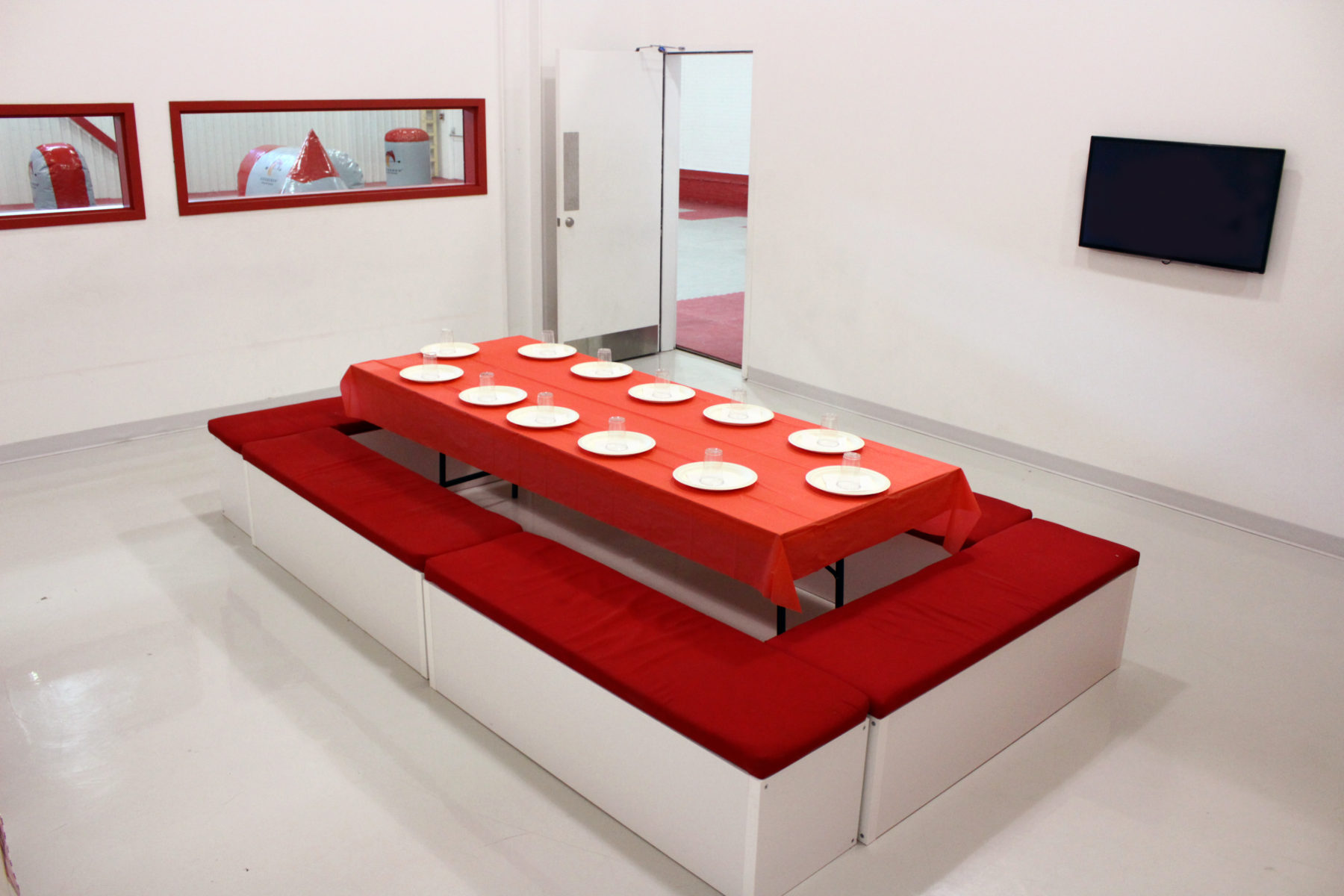 En option, réservez la salle des fêtes avec vue sur le terrain. Elle inclut tables et chaises pour les invités. N’hésitez pas à apporter breuvages et nourriture, incluant un gâteau d’anniversaire !